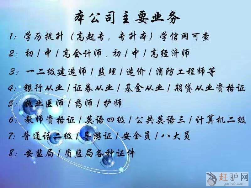 本公司主要业务有(直出+考试):1:学历提升(高起专,专升本)学信网可查。2:初/中/高会计师,初/中/高经济师3:一二级建造师/监理/造价/消防工程师等4:银行从业/证券从业/基金从业/期贷从业资格...